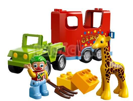 Vydaj sa do sveta s cirkusom! Pomôž klaunovi naložiť na cirkusový transportér s pomaľovaným prívesom malú žirafu a vydajte sa na cestu! Nakŕm zvieratká vidlami a postav si niečo z LEGO® DUPLO® kociek! Obsahuje DUPLO figúrku klauna.